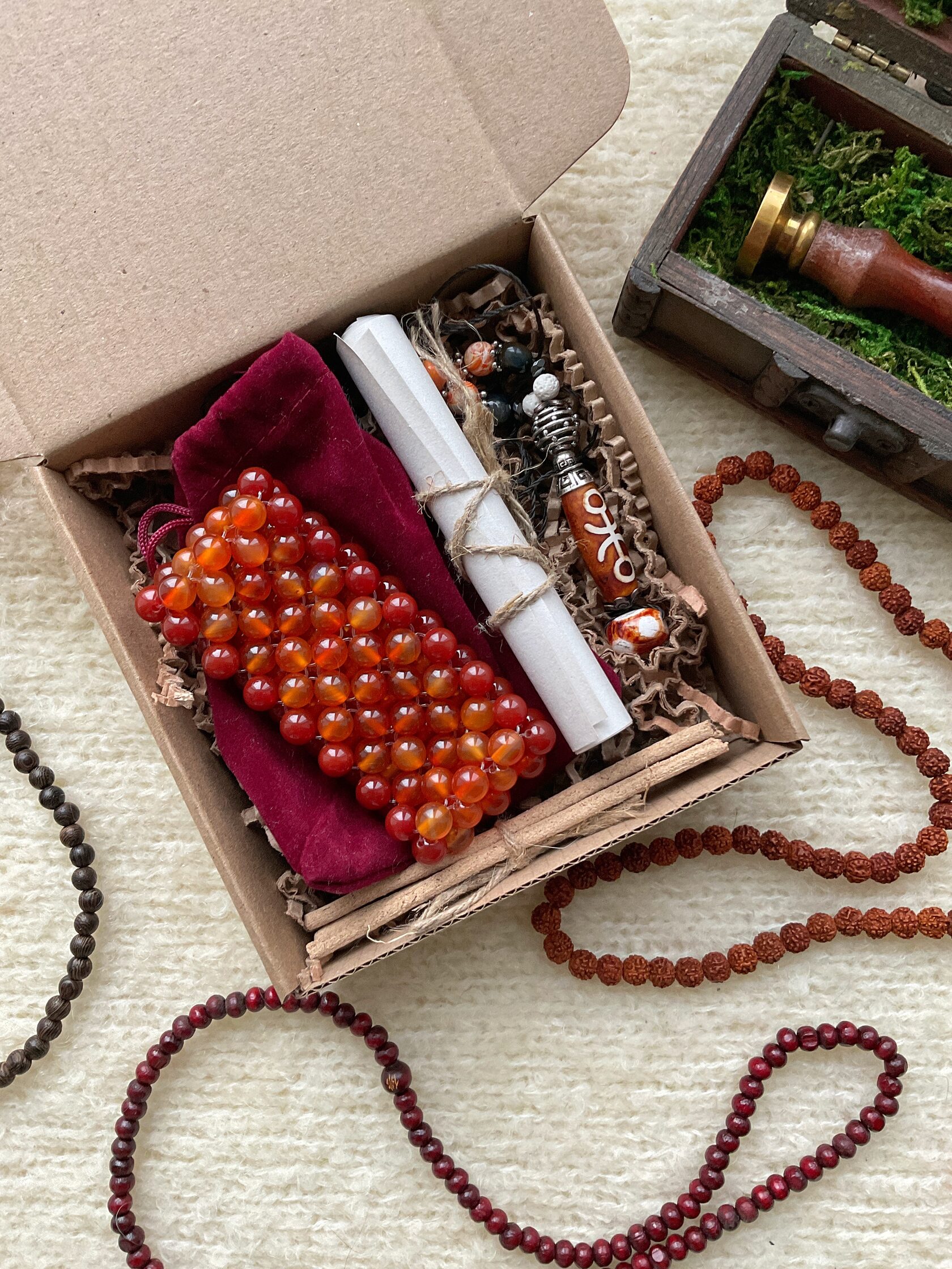 В каждой коробочке с индивидуальным браслетом: длинный свиток с описанием свойств камней твоего талисмана палочка-благовоние открытка, подписанная вручную